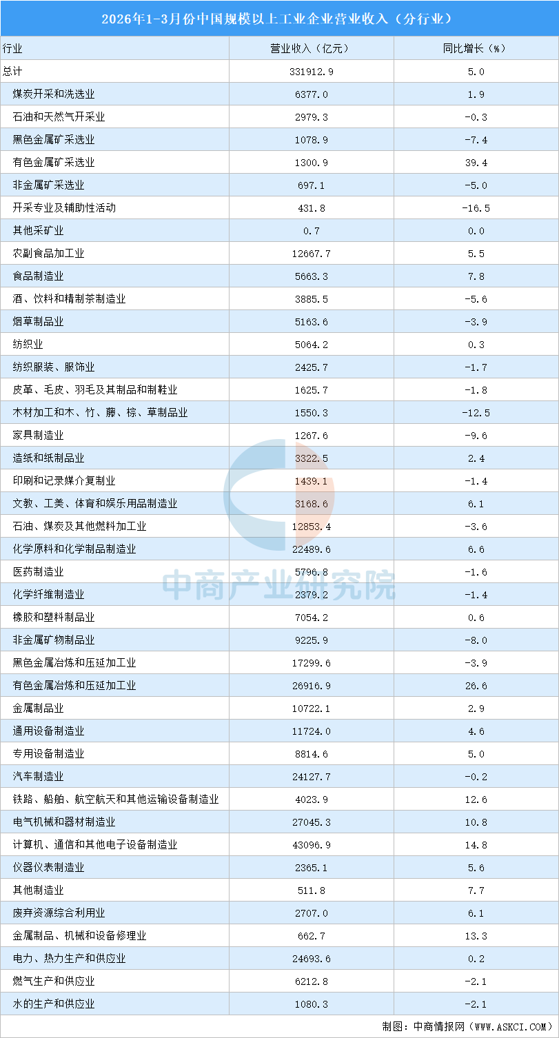 1—3月份,主要行业营收情况如下:计算机、通信和其他电子设备制造业利润同比增长14.8%,有色金属冶炼和压延加工业增长26.6%,化学原料和化学制品制造业增长6.6%,煤炭开采和洗选业增长1.9%,石油、煤炭及其他燃料加工业下降3.6%,电气机械和器材制造业增长10.8%,石油和天然气开采业下降0.3%,通用设备制造业增长4.6%,电力、热力生产和供应业增长0.2%,农副食品加工业增长5.5%。