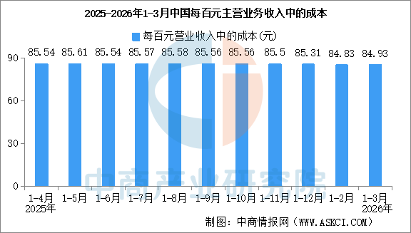 1—3月份,规模以上工业企业每百元营业收入中的成本为84.93元,同比减少0.40元;每百元营业收入中的费用为8.50元,同比减少0.01元。