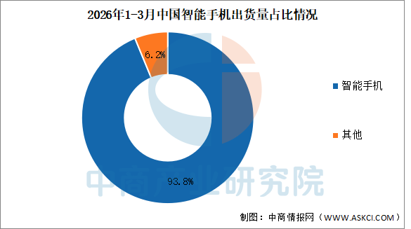 目前手机市场基本由智能手机主导,2026年1-3月,智能手机出货量5704.0万部,同比下降11.6%,占同期手机出货量的93.8%。