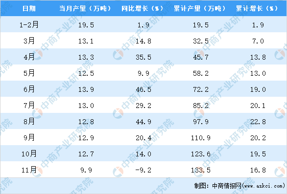 中商情报网讯:据中商产业研究院数据库显示,2020年11月陕西省农用氮磷钾化肥产量为9.92万吨,同比下降9.16%。