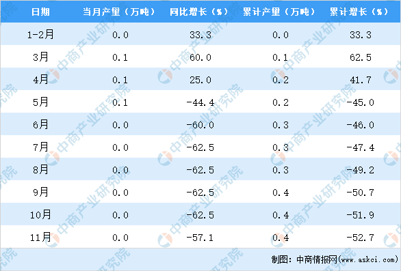 中商情报网讯:据中商产业研究院数据库显示,2020年11月陕西省化学农药原药产量为0.03万吨,同比下降57.14%。