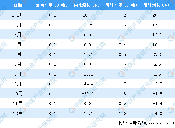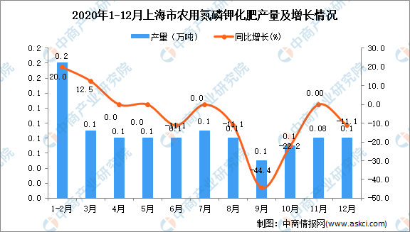 中商情报网讯:据中商产业研究院数据库显示,2020年12月上海市农用氮磷钾化肥产量为0.1万吨,同比下降11.1%。