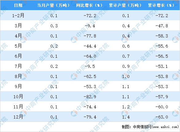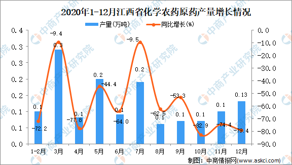 中商情报网讯:据中商产业研究院数据库显示,2020年12月江西省化学农药原药产量为0.13万吨,同比下降79.4%。