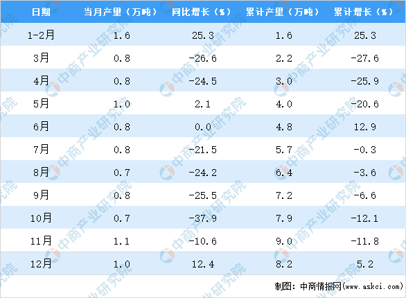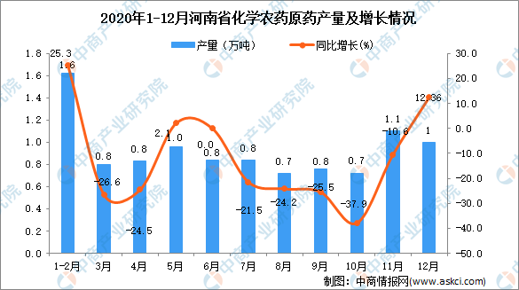 中商情报网讯:据中商产业研究院数据库显示,2020年12月河南省化学农药原药产量为1万吨,同比增长12.36%。