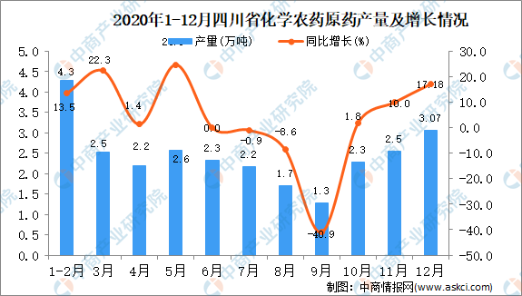 中商情报网讯:据中商产业研究院数据库显示,2020年12月四川省化学农药原药产量为3.07万吨,同比增长17.18%。