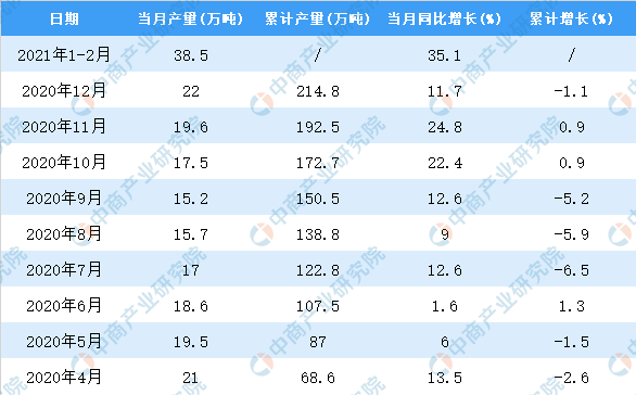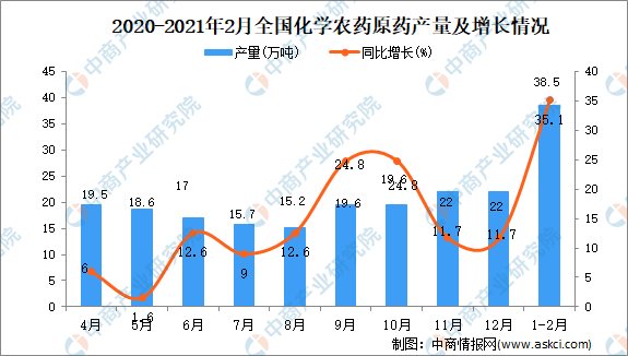 中商情报网讯:据中商产业研究院数据库显示,2021年1-2月全国化学农药原药产量为38.5万吨,同比增长35.1%。
