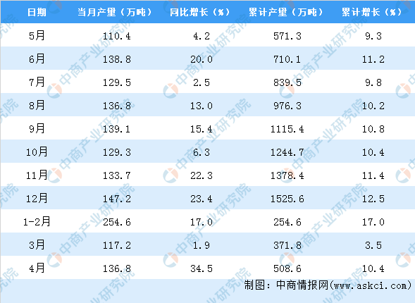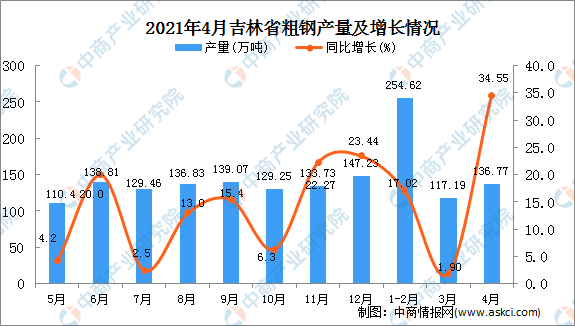 中商情报网讯:据中商产业研究院数据库显示,2021年4月吉林省粗钢产量为136.77万吨,同比增长34.55%。