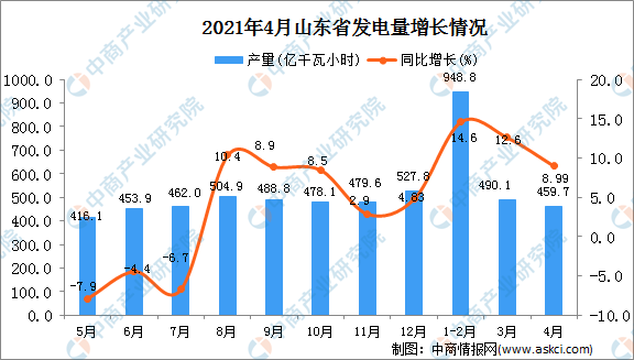 中商情报网讯:据中商产业研究院数据库显示,2021年4月山东省发电量为459.7亿千瓦小时,同比增加8.99%。