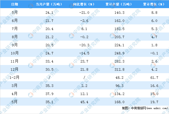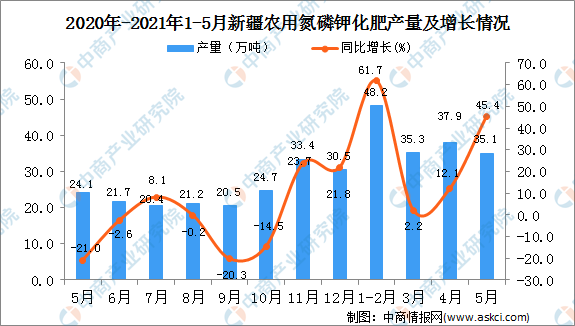 中商情报网讯:据中商产业研究院数据库显示,2021年5月新疆农用氮磷钾化肥产量为35.1万吨,同比增长45.4%。