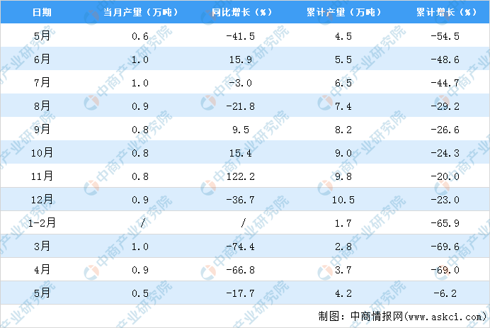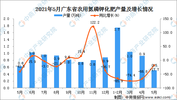 中商情报网讯:据中商产业研究院数据库显示,2021年5月广东省农用氮磷钾化肥产量为0.5万吨,同比下降17.7%。