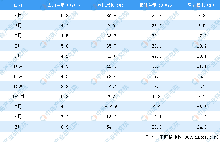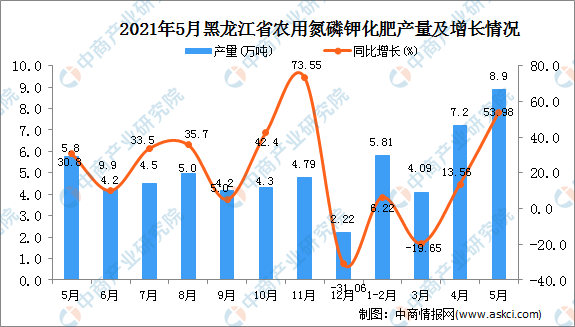 中商情报网讯:据中商产业研究院数据库显示,2021年5月黑龙江农用氮磷钾化肥产量为8.9万吨,同比增长53.98%。