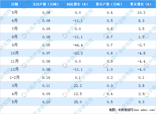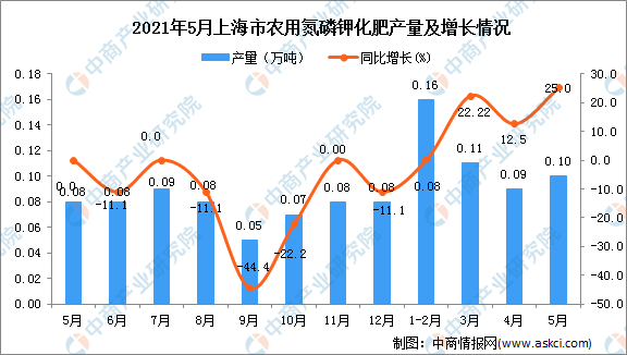 中商情报网讯:据中商产业研究院数据库显示,2021年5月上海市农用氮磷钾化肥产量为0.1万吨,同比增长25%。