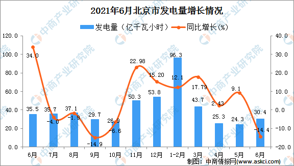中商情报网讯:据中商产业研究院数据库显示,2021年6月北京市发电量产量为30.4亿千瓦小时,同比下降14.4%。