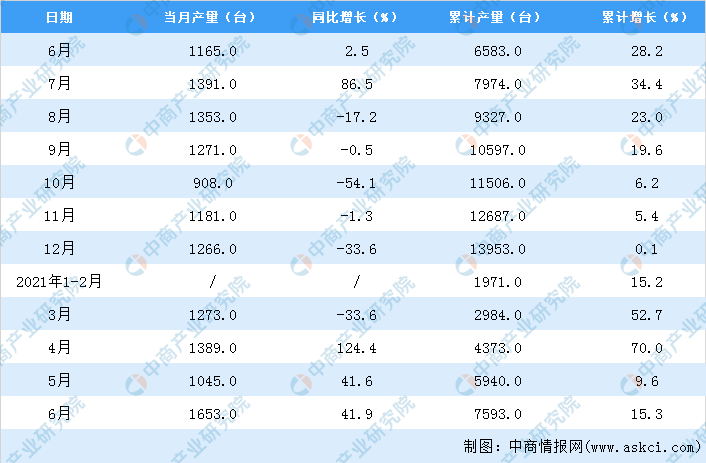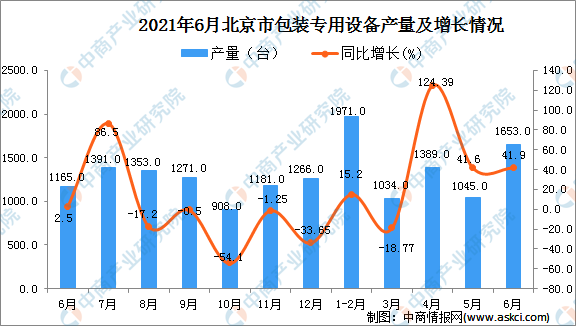 中商情报网讯:据中商产业研究院数据库显示,2021年6月北京市包装专用设备产量为1653台,同比增长41.9%。