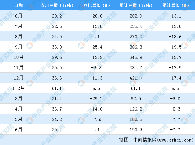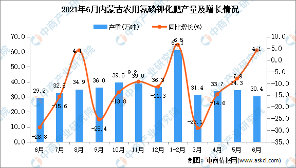 中商情报网讯:据中商产业研究院数据库显示,2021年6月内蒙古农用氮磷钾化肥产量为30.4万吨,同比上升4.1%。