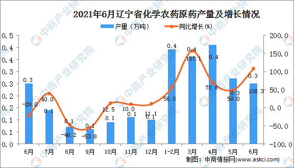 中商情报网讯:据中商产业研究院数据库显示,2021年6月辽宁省化学农药原药产量为0.3万吨,同比上升108.3%。