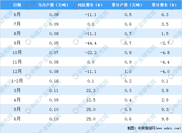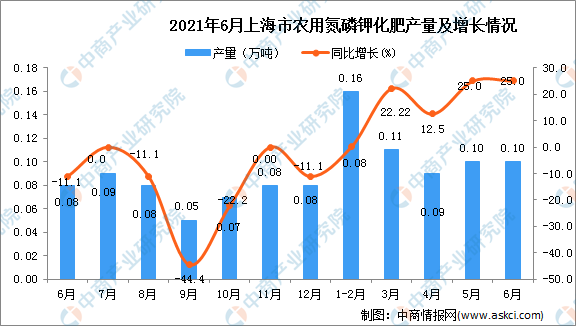 中商情报网讯:据中商产业研究院数据库显示,2021年6月上海市农用氮磷钾化肥产量为0.1万吨,同比上升25%。