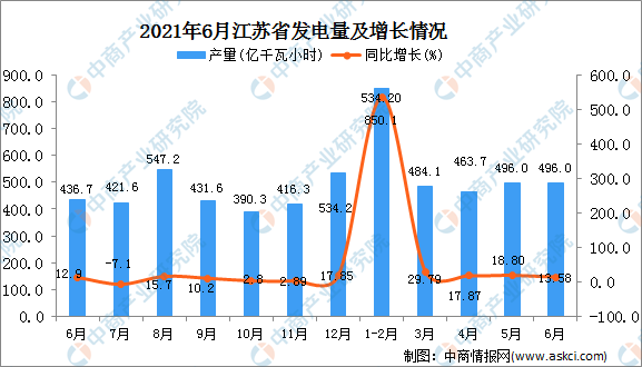 中商情报网讯:据中商产业研究院数据库显示,2021年6月江苏省发电量为496亿千瓦小时,同比上升13.58%。