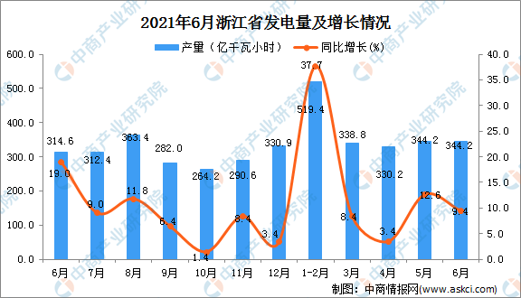 中商情报网讯:据中商产业研究院数据库显示,2021年6月浙江省发电量为344.2亿千瓦小时,同比上升9.4%。