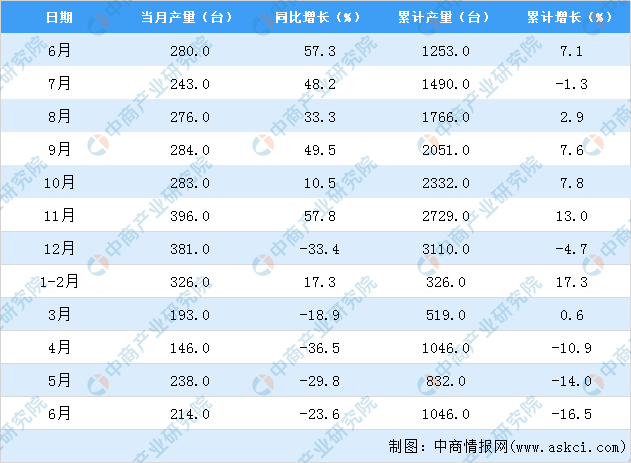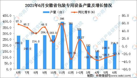 中商情报网讯:据中商产业研究院数据库显示,2021年6月安徽省包装专用设备为214台,同比下降23.6%。
