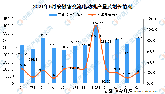 中商情报网讯:据中商产业研究院数据库显示,2021年6月安徽省交流电动机为315.4万千瓦,同比上升19.8%。