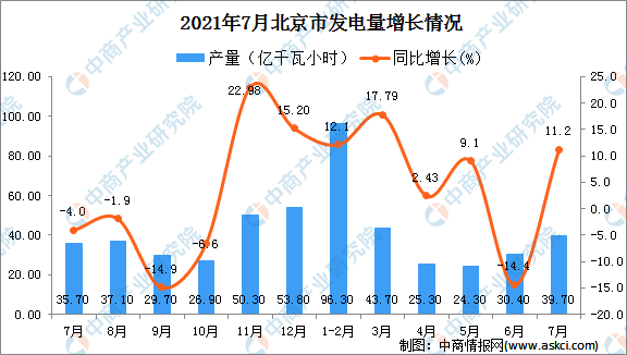 中商情报网讯:据中商产业研究院数据库显示,2021年7月北京市发电量为39.7亿千瓦小时,同比上升11.2%。