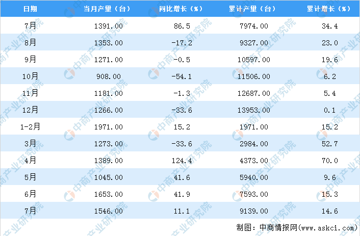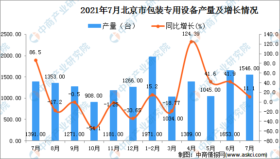 中商情报网讯:据中商产业研究院数据库显示,2021年7月北京市包装专用设备为1546台,同比上升11.1%。