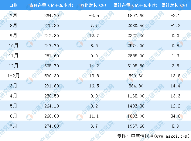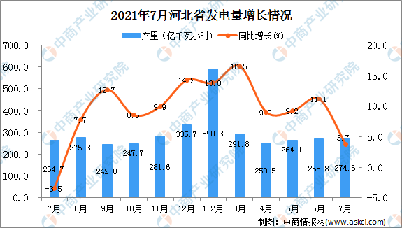 中商情报网讯:据中商产业研究院数据库显示,2021年7月河北省发电量274.6亿千瓦小时,同比上升3.7%。
