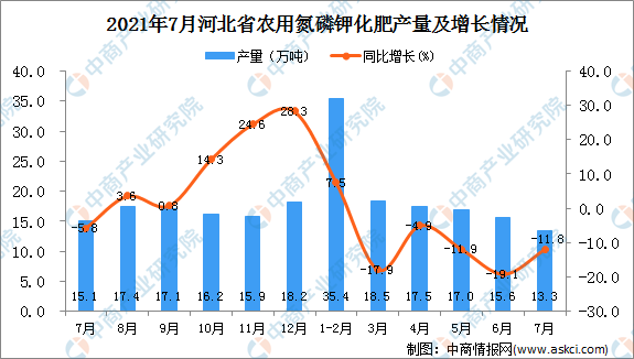 中商情报网讯:据中商产业研究院数据库显示,2021年7月河北省农用氮磷钾化肥13.3万吨,同比下降11.8%。