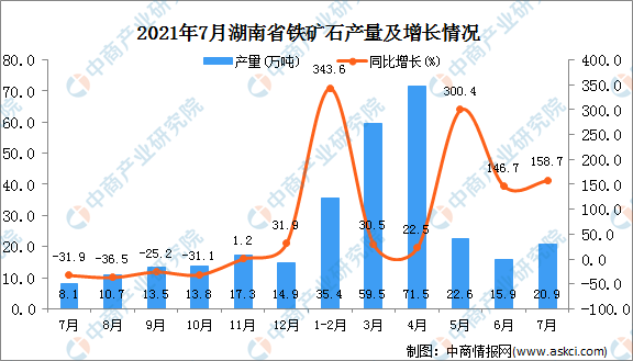 中商情报网讯:据中商产业研究院数据库显示,2021年7月湖南省铁矿石20.9万吨,同比增长158.7%。