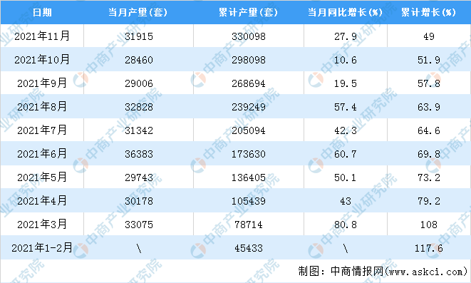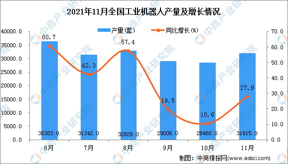 中商情报网讯:据中商产业研究院数据库显示,2021年11月全国工业机器人产量31915套,同比增长27.9%。