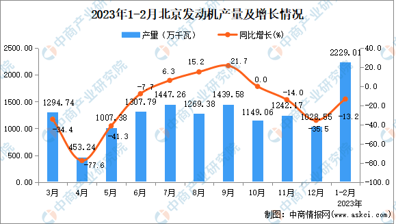 中商情报网讯:据中商产业研究院数据库显示,2023年1-2月北京发动机产量与去年同期相比增长。2023年1-2月北京发动机产量为2229.01万千瓦,同比增长13.2。