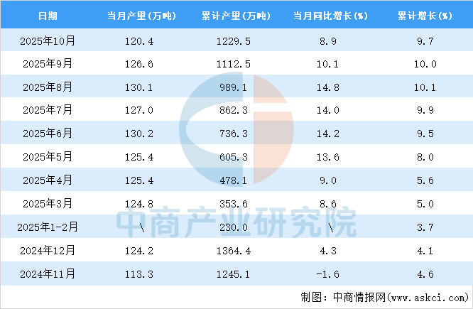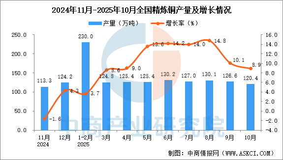 中商情报网讯:据中商产业研究院数据库,2025年10月全国精炼铜(电解铜)当月产量与去年同期相比增长。2025年10月全国精炼铜产量为120.4万吨,同比增长8.9%。2025年1-10月全国精炼铜产量为1229.5万吨,同比增长9.7%。