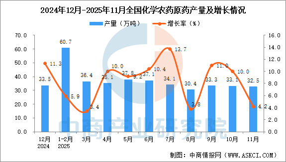 中商情报网讯:据中商产业研究院数据库,2025年11月全国化学农药原药(折有效成分100%)当月产量与去年同期相比增长。2025年11月全国化学农药原药产量为32.5万吨,同比增长4.2%。2025年1-11月全国化学农药原药产量375.3万吨,同比增长7.7%。