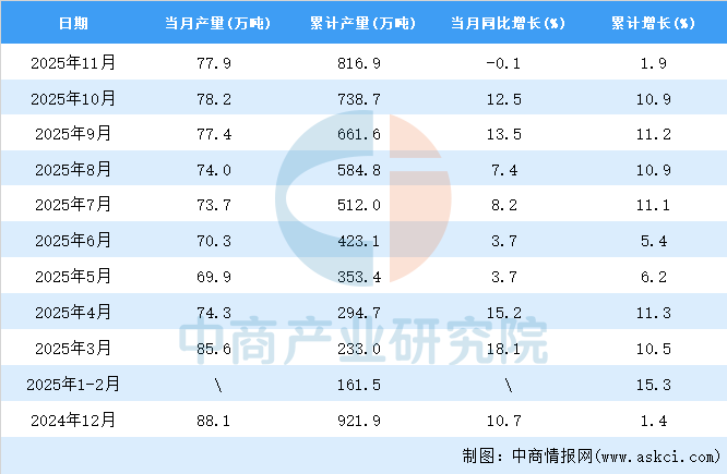 中商情报网讯:据中商产业研究院数据库,2025年11月全国合成橡胶当月产量与去年同期相比下降。2025年11月全国合成橡胶产量为77.9万吨,同比下降0.1%。2025年1-11月全国合成橡胶产量816.9万吨,同比增长1.9%。