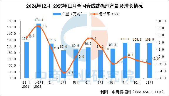 中商情报网讯:据中商产业研究院数据库显示,2025年11月全国合成洗涤剂当月产量与去年同期相比下降。2025年11月全国合成洗涤剂产量为109.9万吨,同比下降2.0%。2025年1-11月全国合成洗涤剂产量1089.1万吨,同比下降0.6%。