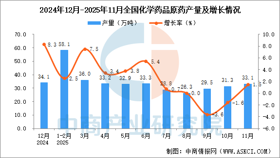 中商情报网讯:据中商产业研究院数据库,2025年11月全国化学药品原药当月产量与去年同期相比增长。2025年11月全国化学药品原药产量为33.1万吨,同比增长1.5%。2025年1-11月全国化学药品原药产量335.8万吨,同比增长1.8%。