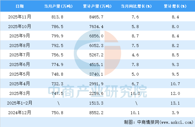 中商情报网讯:据中商产业研究院数据库,2025年11月全国氧化铝当月产量与去年同期相比增长。2025年11月全国氧化铝产量为813.8万吨,同比增长7.6%。2025年1-11月全国氧化铝产量8465.7万吨,同比增长8.4%。