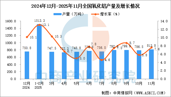2025年11月全国氧化铝产量增长情况