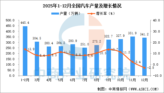 中商情报网讯:据中商产业研究院数据库,2025年12月全国汽车当月产量与去年同期相比下降。2025年12月全国汽车产量为341.2万辆,同比下降2.8%。2025年1-12月全国汽车产量为3477.8万辆,同比增长9.8%。