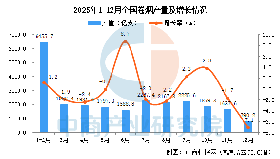 中商情报网讯:据中商产业研究院数据库,2025年12月全国卷烟当月产量与去年同期相比下降。2025年12月全国卷烟产量为790.2亿支,同比下降7.1%。2025年1-12月全国卷烟产量为24703.9亿支,同比增长0.2%。