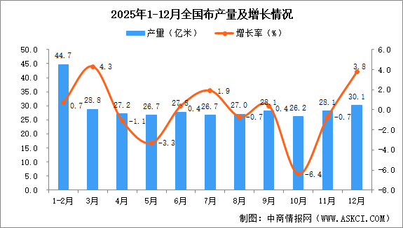 中商情报网讯:据中商产业研究院数据库显示,2025年12月全国布当月产量与去年同期相比增长。2025年12月全国布产量为30.1亿米,同比增长3.8%。2025年1-12月全国布产量306.7亿米,同比增长0.2%。