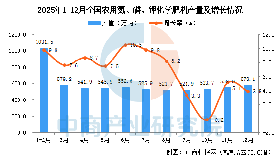 中商情报网讯:据中商产业研究院数据库,2025年12月全国农用氮、磷、钾化学肥料当月产量与去年同期相比增长。2025年12月全国农用氮、磷、钾化学肥料产量为578.1万吨,同比增长3.9%。2025年1-12月全国农用氮、磷、钾化学肥料产量6480.8万吨,同比增长7.1%。