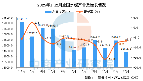 中商情报网讯:据中商产业研究院数据库,2025年12月全国水泥当月产量与去年同期相比下降。2025年12月全国水泥产量为14416.4万吨,同比下降6.6%。2025年1-12月全国水泥产量169314.3万吨,同比下降6.9%。