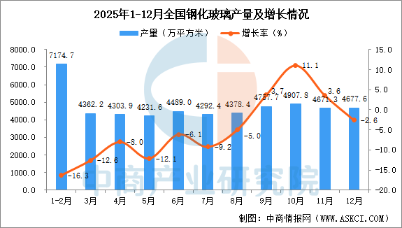 中商情报网讯:据中商产业研究院数据库,2025年12月全国钢化玻璃当月产量与去年同期相比下降。2025年12月全国钢化玻璃产量为4677.6万平方米,同比下降2.6%。2025年1-12月全国钢化玻璃产量50757.2万平方米,同比增长3.4%。