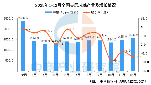 中商情报网讯:据中商产业研究院数据库,2025年12月全国夹层玻璃当月产量与去年同期相比下降。2025年12月全国夹层玻璃产量为1556.2万平方米,同比下降7.1%。2025年1-12月全国夹层玻璃产量为16422.8万平方米,同比增长2.7%。