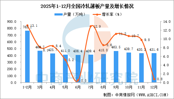 中商情报网讯:据中商产业研究院数据库,2025年12月全国冷轧薄板当月产量与去年同期相比增长。2025年12月全国冷轧薄板产量为431.6万吨,同比增长0.8%。2025年1-12月全国冷轧薄板产量4851.7万吨,同比增长6.9%。