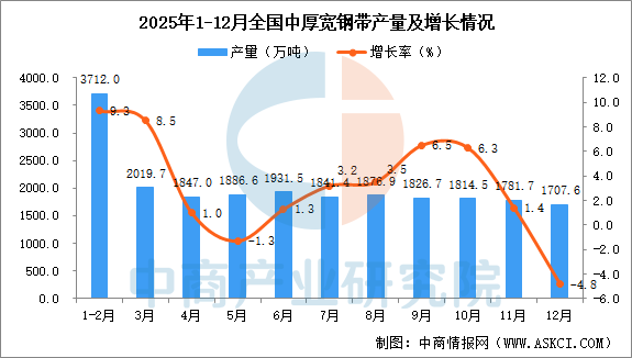 中商情报网讯:据中商产业研究院数据库显示,2025年12月全国中厚宽钢带当月产量与去年同期相比下降。2025年12月全国中厚宽钢带产量为1707.6万吨,同比下降4.8%。2025年1-12月全国中厚宽钢带产量22268.0万吨,同比增长4.2%。