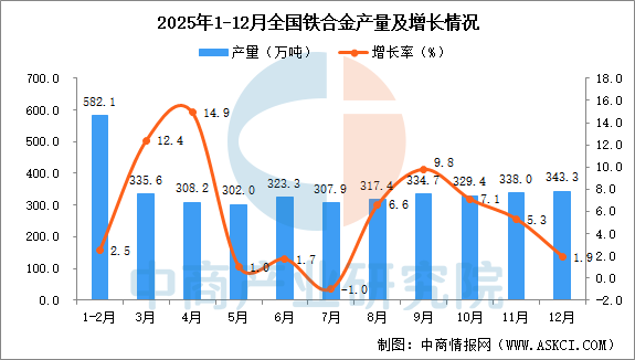 中商情报网讯:据中商产业研究院数据库,2025年12月全国铁合金当月产量与去年同期相比增长。2025年12月全国铁合金产量为343.3万吨,同比增长1.9%。2025年1-12月全国铁合金产量3816.0万吨,同比增长5.6%。