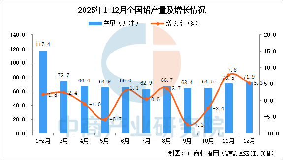 中商情报网讯:据中商产业研究院数据库,2025年12月全国铅当月产量与去年同期相比增长。2025年12月全国铅产量为71.9万吨,同比增长5.3%。2025年1-12月全国铅产量为774.2万吨,同比增长2.8%。